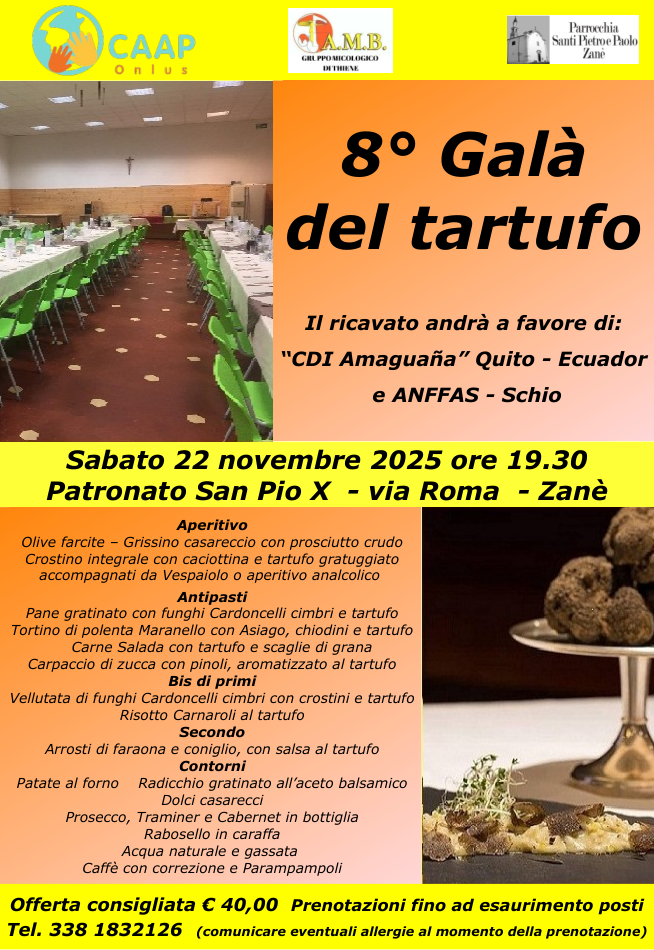 Sabato 22 novembre 2025 alle ore 19.30, presso il Patronato San Pio X di Zanè (via Roma), si terrà l’8ª edizione del Galà del Tartufo, un appuntamento ormai tradizionale che unisce gusto, convivialità e solidarietà.