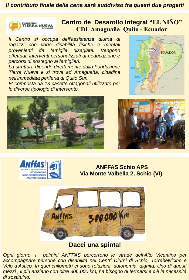 Il ricavato della serata sarà devoluto al Centro de Desarrollo Integral “El Niño” di Amaguaña (Quito, Ecuador) e all’ANFFAS di Schio, due realtà impegnate nel sostegno a persone con disabilità e alle loro famiglie.